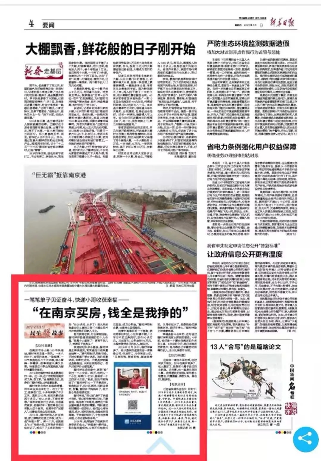 江蘇省快遞協(xié)會孫安寧會長應新華日報之邀進行專家點評,在點評中孫會長指出,快遞員在2019年習總書記新年講話中被贊譽為美好生活的創(chuàng)造者、守護者。目前中國快遞業(yè)務量已連續(xù)6年世界第一,今年業(yè)務總量又首次超過美國、歐洲及日本業(yè)務量的總和。這一令人驚嘆的奇跡凝聚著全國數(shù)百萬快遞小哥們的勤勞和智慧。程村洋就是千千萬萬快遞小哥的典型代表。他勤奮、敬業(yè)、善良、節(jié)儉,通過服務千家萬戶,進而改善了自己的家庭生活,并能夠?qū)崿F(xiàn)由鹽城響水農(nóng)村到南京買房安家的大跨越,又一次印證了“幸福是奮斗出來的”至理名言。祝福程村洋似的“小蜜蜂”們在新的一年工作順利,在用力用心用情服務社會的同時,不斷實現(xiàn)自己心中的小目標!