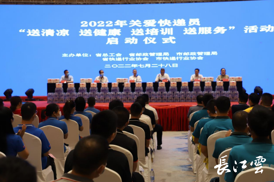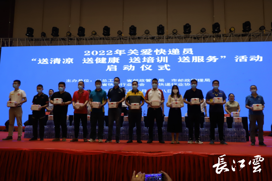 7月28日,關(guān)愛快遞員“送清涼、送健康、送培訓(xùn)、送服務(wù)”活動(dòng)啟動(dòng)儀式在武漢召開,本次活動(dòng)由湖北省總工會(huì)、湖北省郵政管理局、武漢市郵政管理局、湖北省快遞行業(yè)協(xié)會(huì)、武漢市快遞行業(yè)協(xié)會(huì)聯(lián)合舉辦,郵政、順豐、三通一達(dá)、極兔等12家主要快遞企業(yè)和快遞上下游相關(guān)企業(yè)參與,主要內(nèi)容是向快遞企業(yè)代表贈(zèng)送健康卡、清涼物資、高溫預(yù)防救治培訓(xùn)與服務(wù)產(chǎn)品展示與交流。