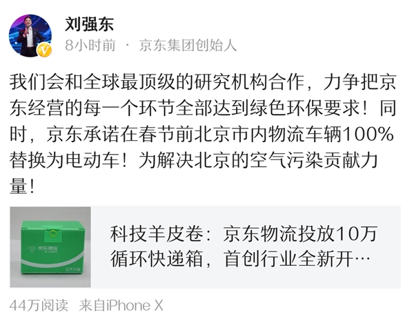 除此之外,劉強(qiáng)東表示“我們會(huì)和全球最頂級(jí)的研究機(jī)構(gòu)合作,力爭(zhēng)把京東經(jīng)營的每一個(gè)環(huán)節(jié)全部達(dá)到綠色環(huán)保要求!同時(shí),京東承諾在春節(jié)前北京市內(nèi)物流車輛100%替換為電動(dòng)車!為解決北京的空氣污染貢獻(xiàn)力量!”