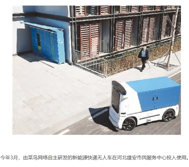 一輛裝滿快遞的無人車正在行駛,一路上,它能夠感知周圍環(huán)境,對行人、車輛等各類動態(tài)、靜態(tài)障礙物進行避讓,完成從驛站到智能柜的快遞接駁運輸。 這并非設(shè)想中的場景。今年3月,由阿里巴巴旗下物流平臺菜鳥網(wǎng)絡(luò)自主研發(fā)的新能源快遞無人車,在河北雄安市民服務(wù)中心投入使用。據(jù)介紹,該無人車一次最多可以裝載200多個小型包裹。這正是當(dāng)下智慧物流的一個縮影。