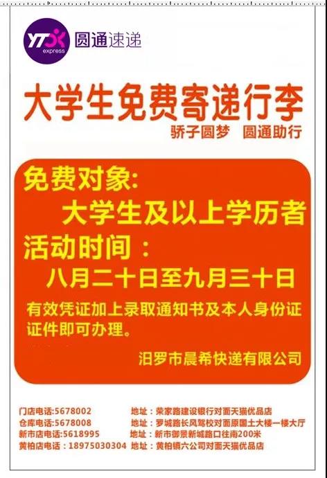 大學(xué)新生只要在今年9月30日之前,持本人身份證、錄取通知書或?qū)W生證在汨羅公司4個(gè)指定站點(diǎn)即可免費(fèi)郵寄生活物品,不限次數(shù)和重量;但寄遞品不能有違禁品,收貨地址只能是就讀學(xué)校地址。同時(shí),公司還免費(fèi)為汨羅籍建檔立卡貧困戶郵寄物品。