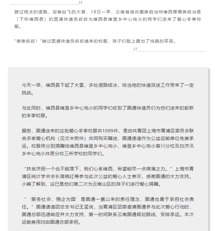 公益 | 1099件愛(ài)心冬裝校服,圓通小哥冒雪接力送達(dá)
