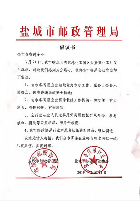 一方有難,八方支援。3月22日,鹽城市郵政管理局和鹽城市快遞行業(yè)協(xié)會(huì)向當(dāng)?shù)匕l(fā)出倡議書(shū),號(hào)召寄遞保障寄遞渠道安全暢通,積極參與救援工作。