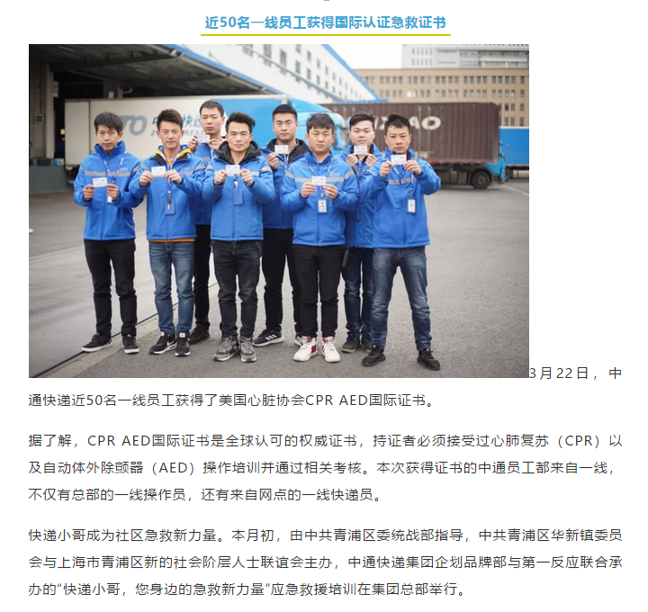 近50名中通一線員工獲得國際認(rèn)證急救證書